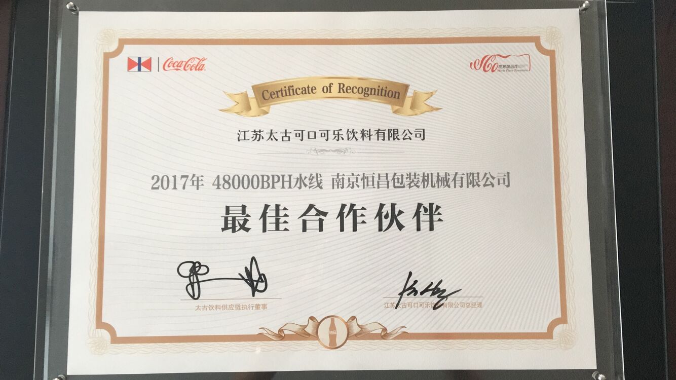 南京恒昌包裝作為后段整包商,在江蘇太古可口可樂48000bph水線項目中獲得“最佳合作伙伴”殊榮!